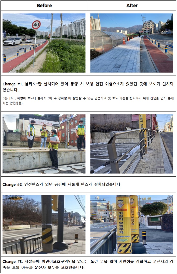 [안전하고 쾌적한 통학로 만들기] 를 지속 사업으로 만들어 다양한 기관이 협력해 안전하고 쾌적한 통학로 만들기 진행