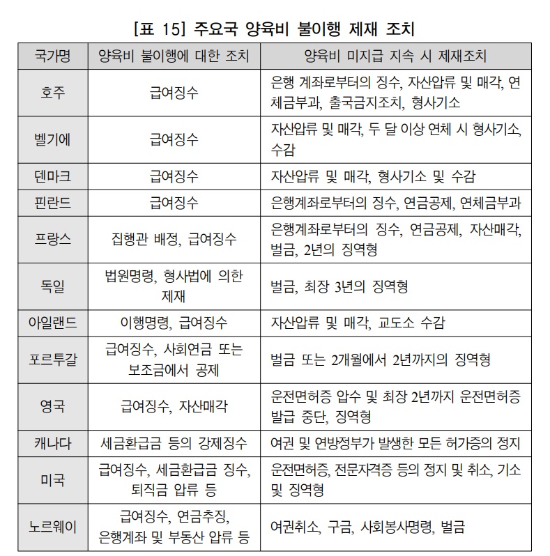 - 미국의 경우는 양육비 미지급자의 운전면허뿐 아니라 의사 면허증 등 전문 자격증까지 모두 정지