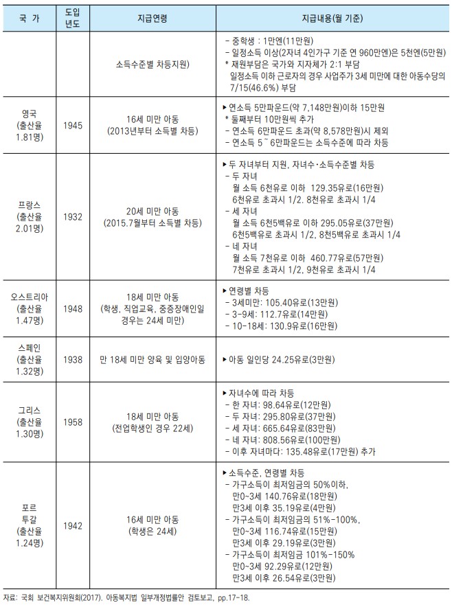 - 일반적으로 의무교육 기간 또는 최소 노동연령에 해당하는 16~18세까지 지급하는 것이 일반적